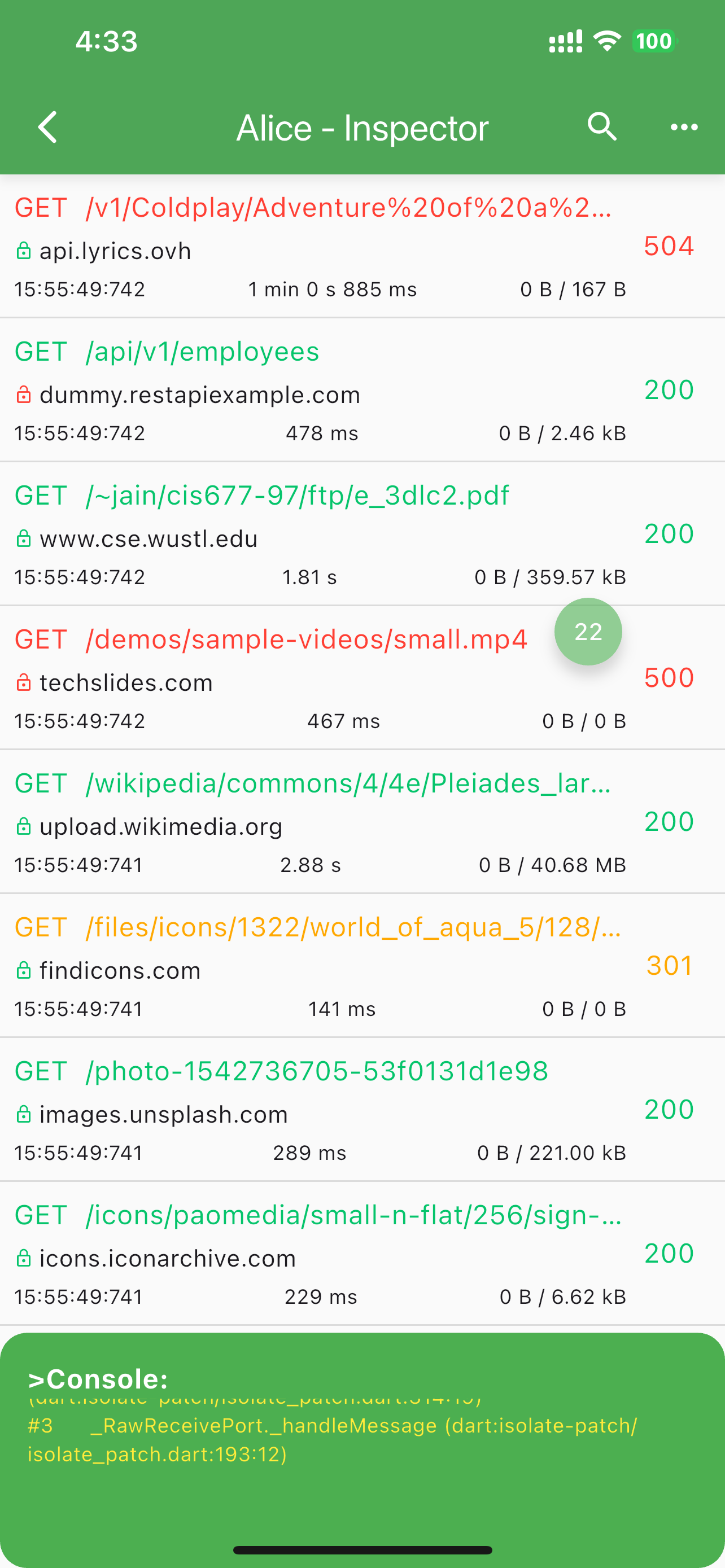 Alice is a powerful HTTP Inspector tool for Flutter developers. It captures, stores, and displays HTTP requests and responses in a user-friendly interface, making debugging network calls effortless. Alice supports popular Dart HTTP clients like Dio, HttpClient, and the http package.