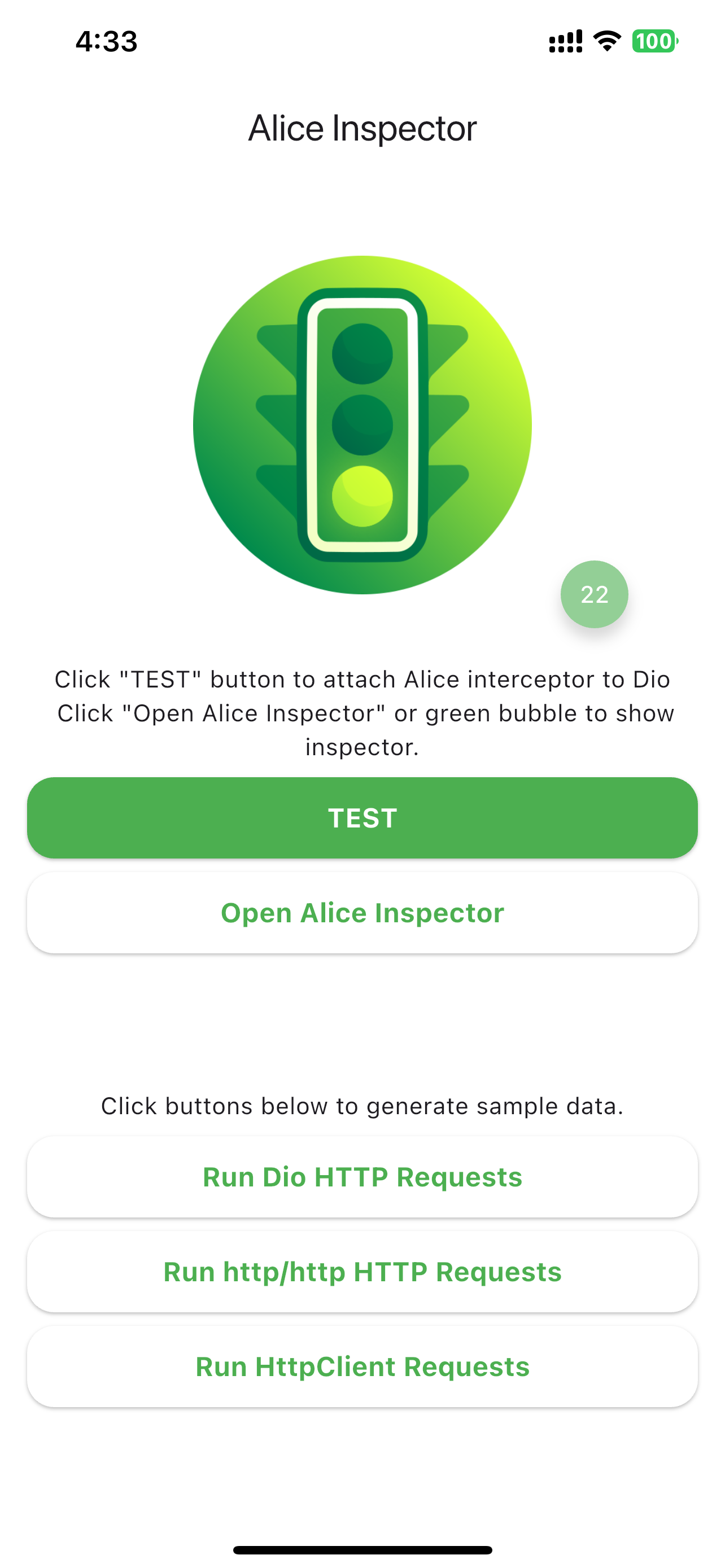 For the easiest setup, wrap your app with AliceInspector. This automatically configures Alice, adds Dio interceptors, and provides a floating inspector button.
