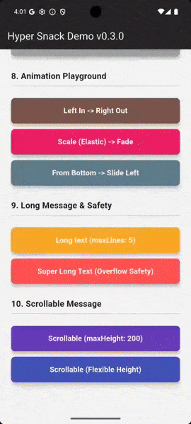 - Smart Updates: Update the content of an existing snackbar by ID without animation glitches.