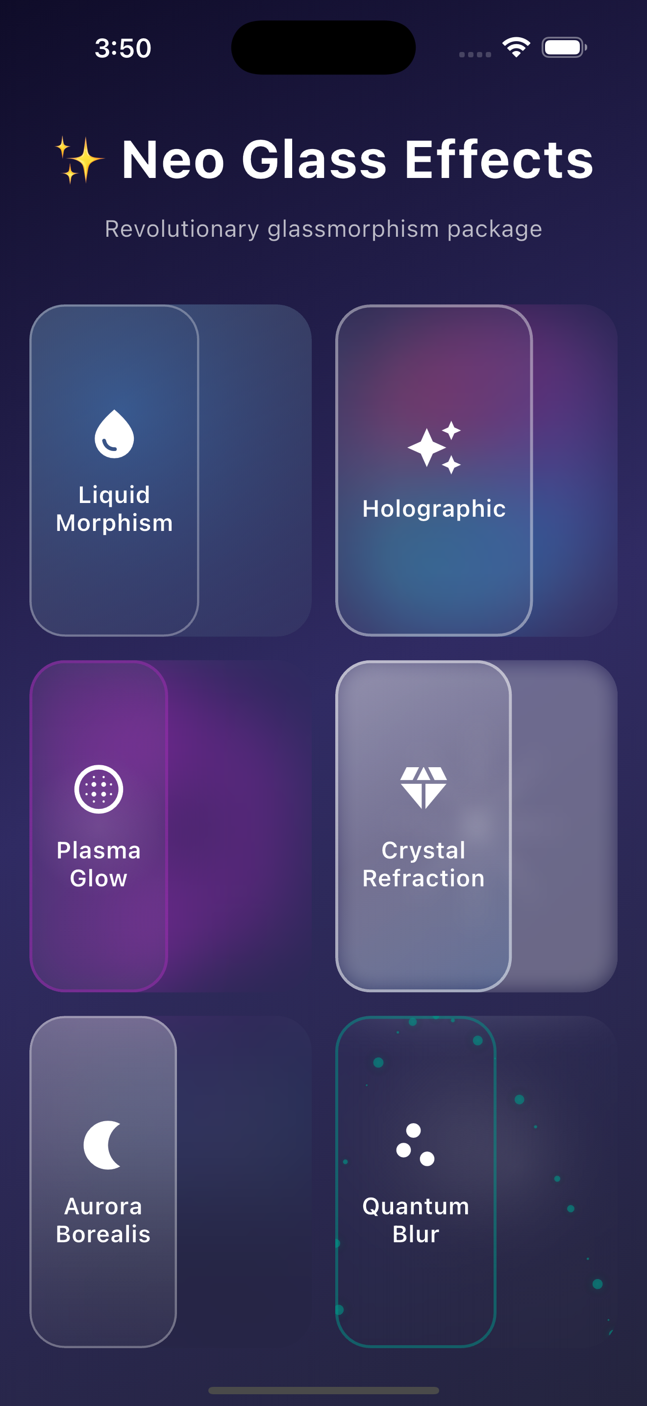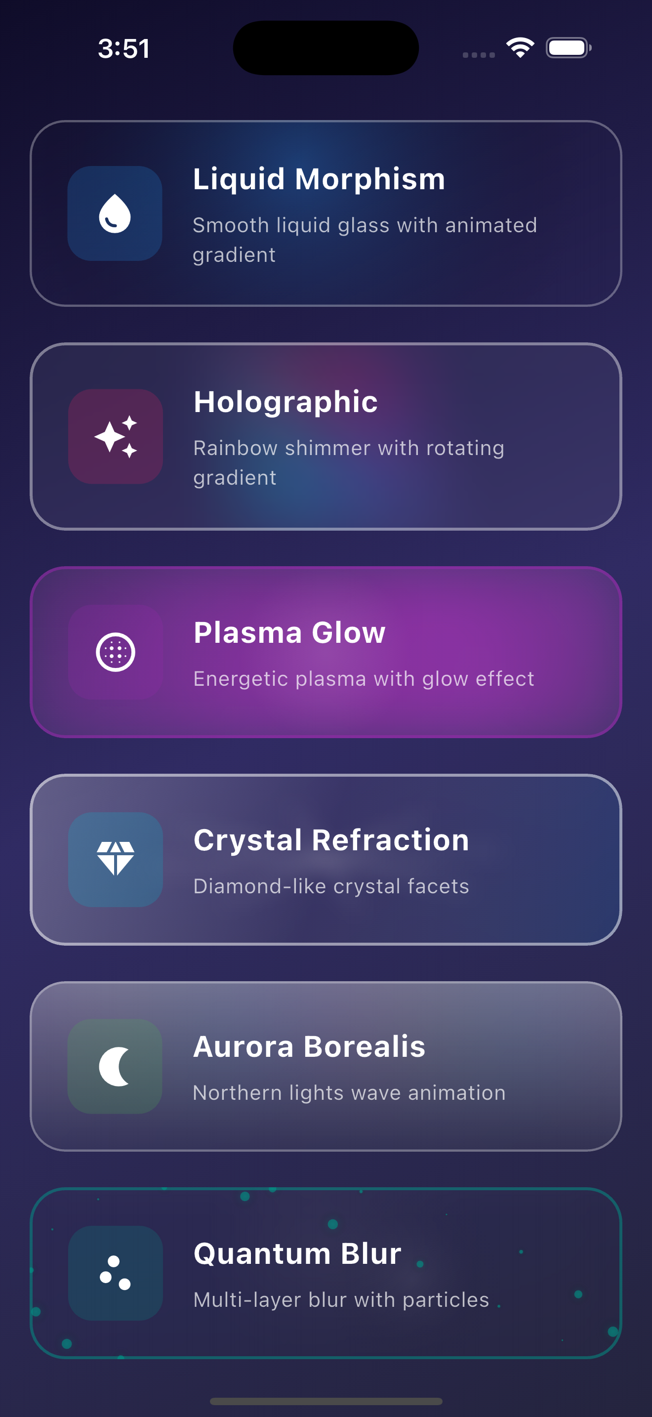 A revolutionary Flutter glassmorphism package with 6 unique effects - Liquid Morphism, Holographic, Plasma, Crystal, Aurora, and Quantum blur effects.